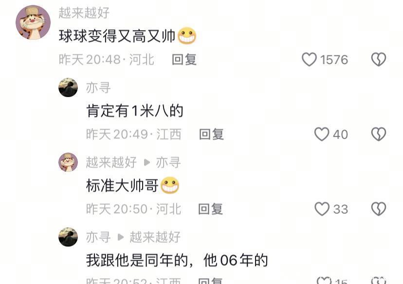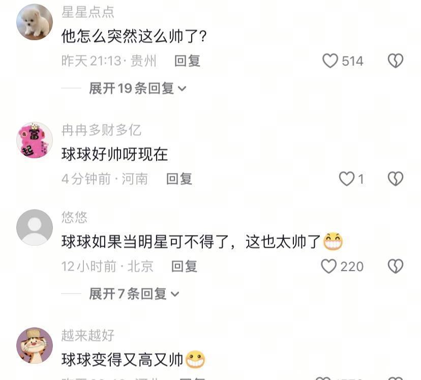 很难想象,球球还是体育生、能长得这么白白净净的,看着非常秀气。不少网友都在夸球球变帅了,这颜值如果不当明星的话真是太可惜了。